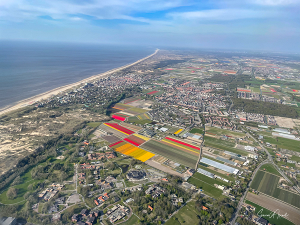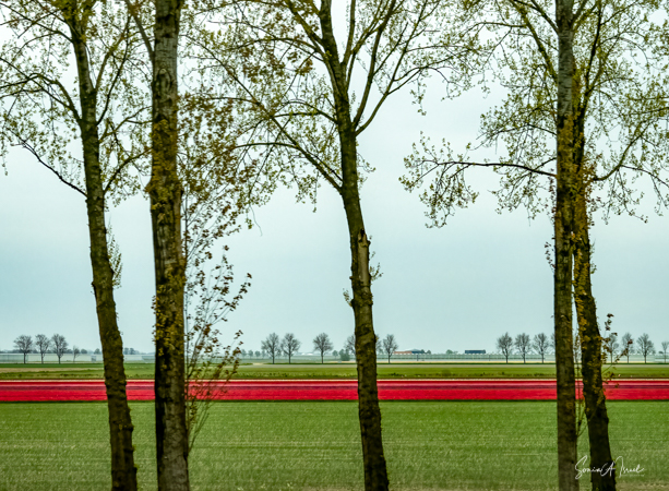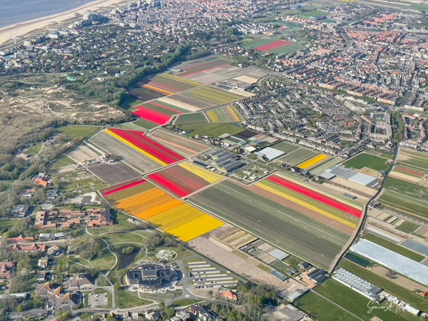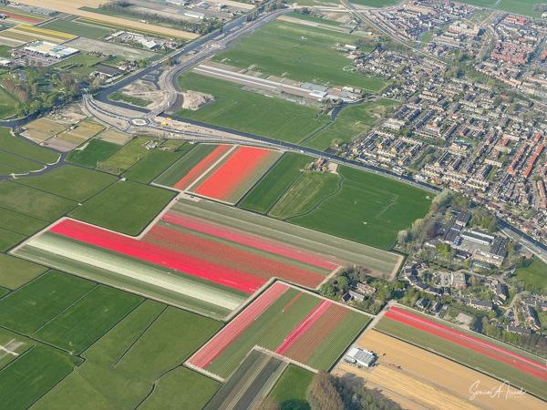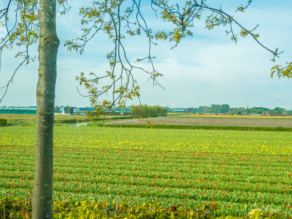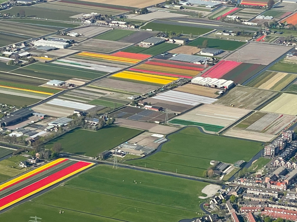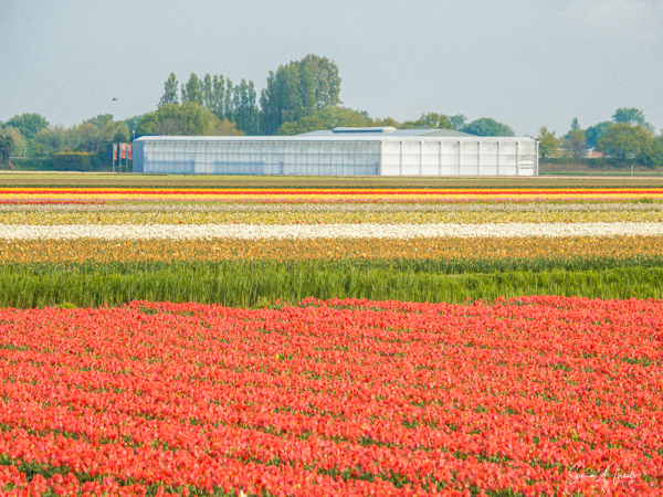 Bollenstreek, on the Dutch coast, is the region in The Netherlands where the tulips grow. The combination of excavated dunes and sea air make it just the right place for the flower bulbs to grow. And in fact, Bollenstreek’ means ‘flower region.’ It is not a large area, less than 24 miles long. But what a 24 miles it is, covered in stipes of color. We first saw it from the air as we approached the Amsterdam airport. I was sitting by the window, just gazing out when all of a sudden I realized that I was looking at tulips. I had waited a long time to see this sight and I was mesmerized by the patterns as seen from the sky. It reminded me of a Mondrian painting.