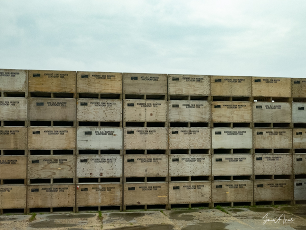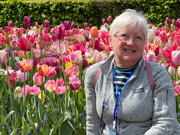 The fields and fields of flowers that we saw were only grown for the bulbs. As the flowers opened up, the heads of the flowers are cut off. Diana Van Der Tuuk, our cruise program director, grew up in the Bollenstreek area, surrounded by tulips and at age 12 she started working on a tulip farm during the summer vacation, doing just that, on her knees cutting off the flower (note by the way that Diana always wore her mask. She took it off for the picture only because we were outside) Now it is done by special machines that leave the bulbs intact, but cut off the flowers heads. When the flower is “beheaded,” all the energy goes into the bulbs. In late summer the bulbs are retrieved, washed, peeled and stored for replanting in October. In order to best retrieve the blubs, a net is placed under them when the are planted which keeps the clay ground from sticking to the bulb and makes it easier to lift them out of the ground.