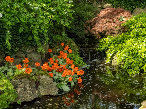 Along with the flowers there were also pieces of art, sculptures and fountains, and of course birds. But what kept catching my eye was the reflections in the ponds and lakes. Bursts of color staring up at their mirror image.
