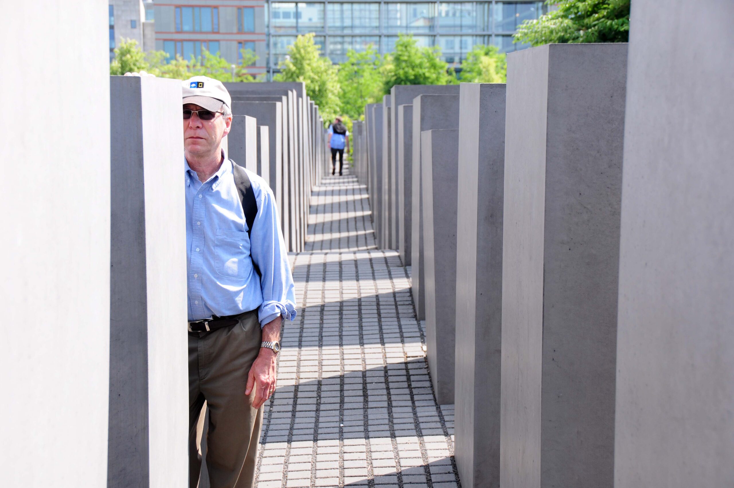 The Holocaust Denkmal or the Memorial to the Murdered Jew of Europe stands just on the other side of the Brandenburg Gate. It was designed by Peter Eisenmann. Different than any other memorial I have seen (and I have seen a lot of them), this one is a series of concrete slabs (2,711 of them) in all different heights, in a straight grid pattern, with walkways that undulate like a roller coaster track. To me (and to many others) it was symbolic of either the chimneys or tombstones, but Eisenmann left it to each of us to create our own interpretations. It left me a bit cold, that is, I was not moved by it. But it did afford many photographic opportunities (one of which is attached). While the memorial above ground did not do much for me, the information center, which is underground, was beautifully done with stories of survivors, stories of the camps – all the things one expects but done with style and much technology. There was a room of dimensions with 15 personal accounts written by survivors. There was a room of families which describes the fates of 15 families. There was a room of sites which describes where the camps were. And a room of names with computers with testimonies from Yad Vashem.