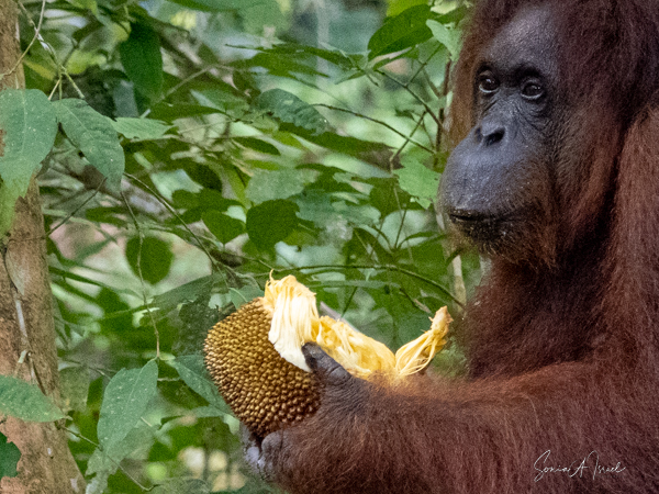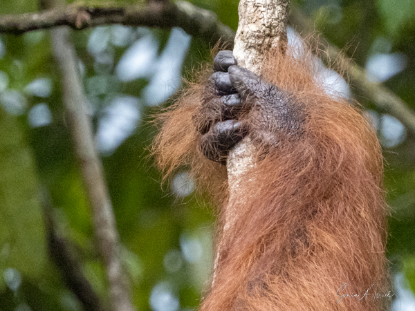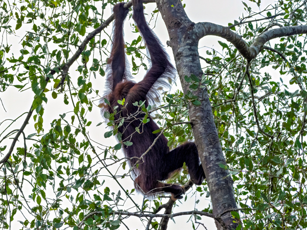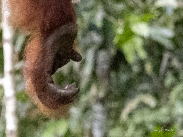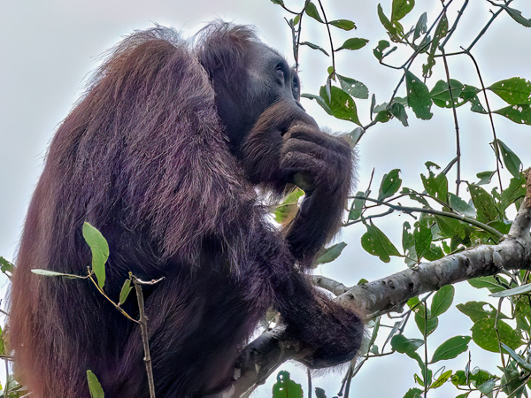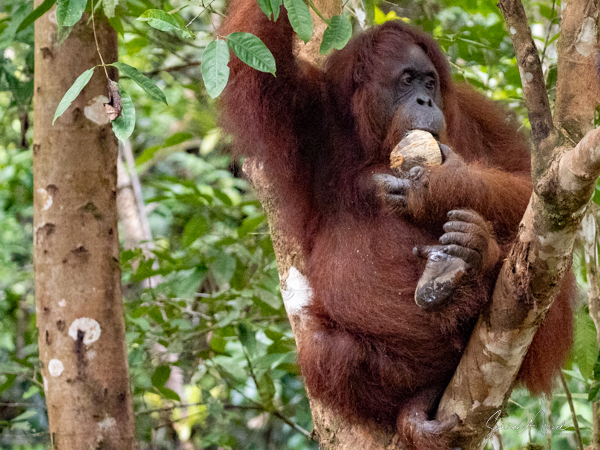 We stayed about two hours, just watching and watching them. This was my first sighting of an orangutan in the wild, or at least not in a zoo. We would see more later, some really in the wild, but, as they say, there is nothing like that first time. What a magnificent creature. The males indeed could be identified by their flanges. And that red fur! What a color. Beautiful.