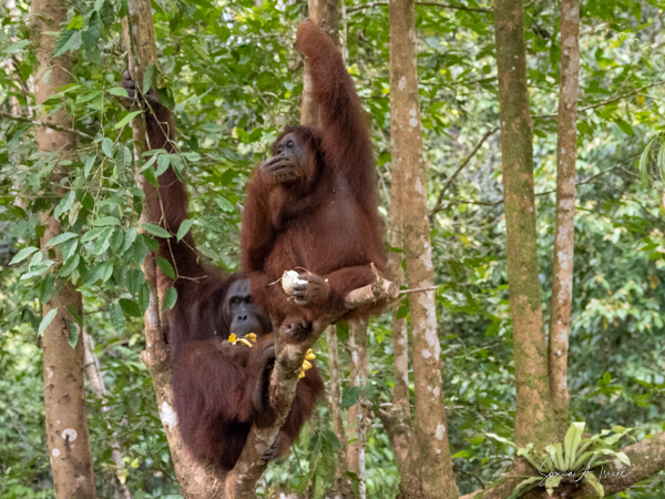 The orangutans had to fight for the fruit, however, as the local macaque monkeys have learned that there is a free buffet here twice a day.