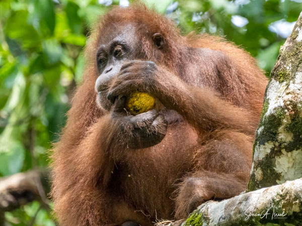 And then over on the other side, we noticed a teenager who was a bright, bright orange and the younger orangutans tend to be. He was climbing down a tall tree heading for the food. And boy was he beautiful.