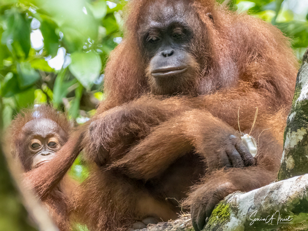And what happens once that male attracts a female? She can start having offspring at about age 15 with 6-9 years between births. During this time, she tends to avoid the males. The females take care of their young, carrying it while traveling, suckling and sleeping with it. During the first four months, the two are in constant physical contact, with the infant clinging to its mother’s belly. At about age 2, the young one begins to move away from its mother, traveling through the canopy holding hands with other orangutans, called “buddy travel.” They may travel away from their mom temporarily, but always return until about age 6 or 7.