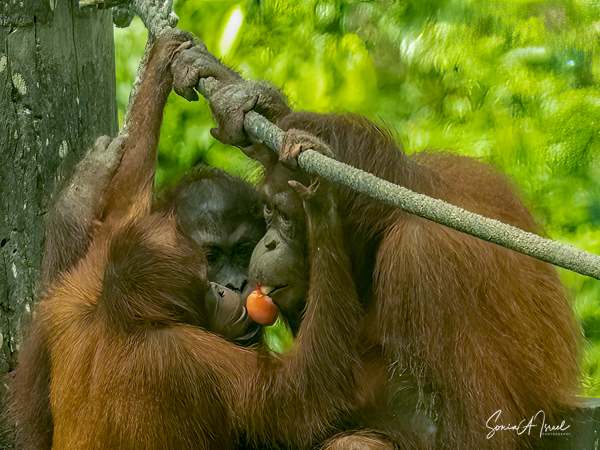 We share about 96.4% of genes with orangutans and like us (or maybe unlike us?), they are very intelligent. They communicate with each other with sounds. As mentioned above, the males will make long calls to attract females, but also to let other males know about their presence. The calls start with grumbles, peak with pulses and end with bubbles. When they are trying to intimidate each other, both males and females will have what’s called a “rolling call” which is a series of low frequency noises. When they are uncomfortable, they produce a “kiss squeak” where they suck in air through pursed lips.