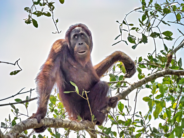 Orangutans are known for their distinctive red fur. They spend most of their time in trees which makes them easier to spot against the foliage. They have long, very powerful arms and they use their hands to grasp and swing through the branches.