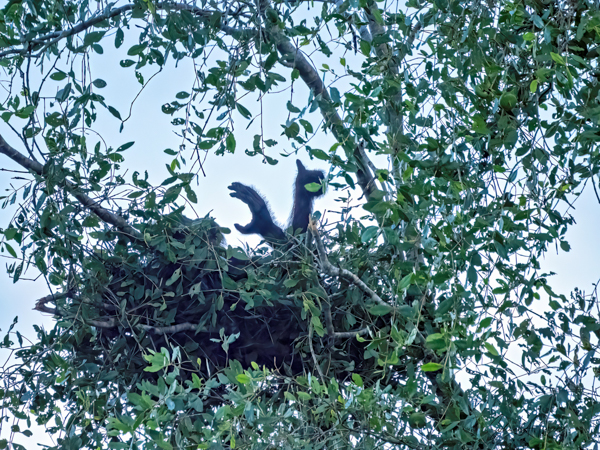 They were swinging through the trees. They were sitting and eating. They were grabbing the food and climbing up, high into the trees.