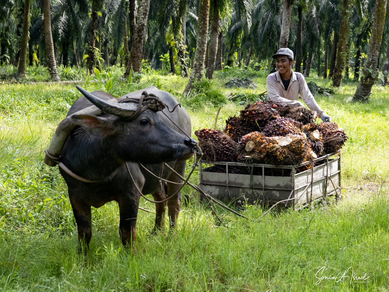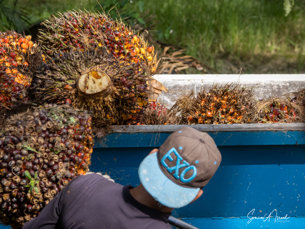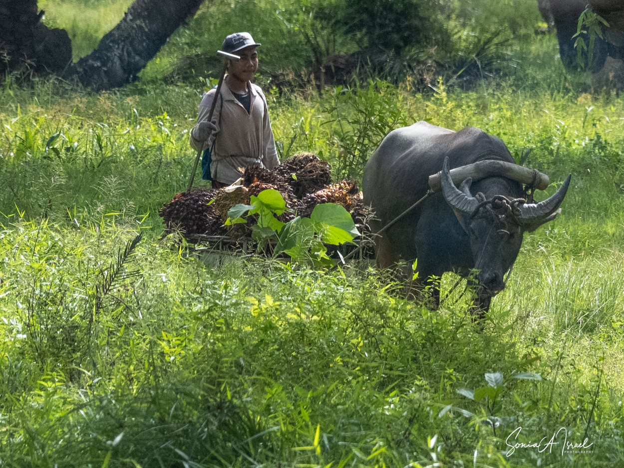 And these plantations create jobs. But the jobs are hard and pay is low. As you can see in the pictures, one man collects the fruit of the palm and using a spike, swings it onto a cart pulled by a buffalo. Then, when it reaches the truck, another man, also using something like a pitchfork, swings the fruit onto the truck. Some communities are part owners and get some money back.