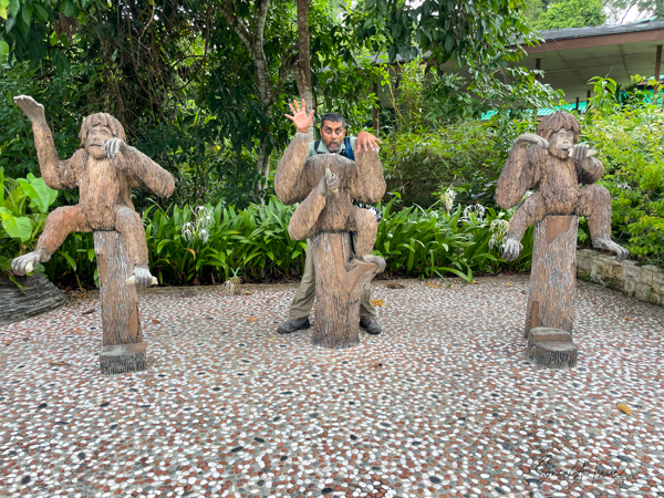 We got there in time for the afternoon feeding. We stood around, behind a low fence, looking up into the trees. We saw one or two orangutans in the trees and were so excited to take pictures with them.