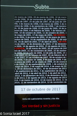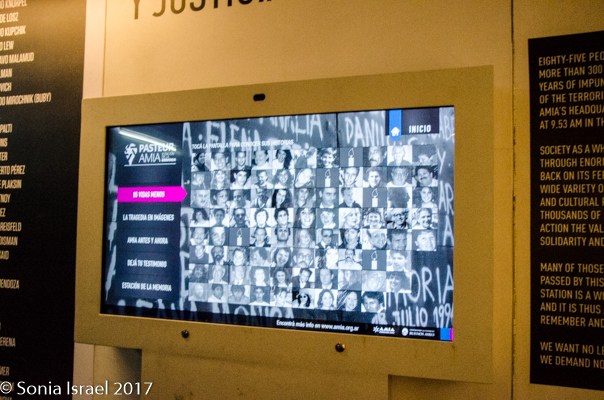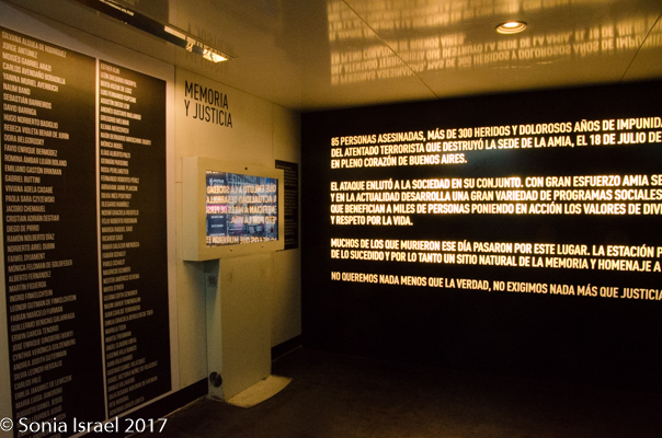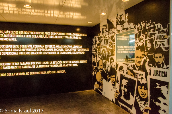 On the first level down is the actual memorial complete with names and photographs of those that died, the story behind it, a typewriter that melted (seeing an actual object makes it so much more real). The introductory sign begins with: âEighty-five people murdered, more than 300 wounded and painful years of impunity are the aftermath of the terrorist attack that destroyed AMISâs headquarters on July 18, 1994 at 9:53 AM in the heart of Buenos Aires.â And everyone that walks into that subway station has to walk by it and be reminded of that terrorist act.