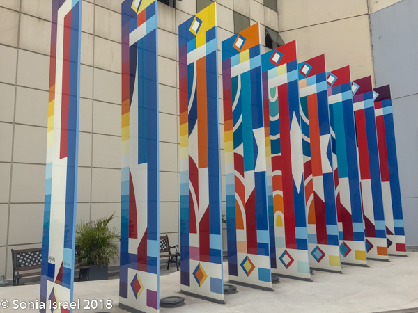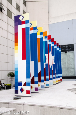 The base of this monument is a large, stepped Magen David (Jewish star). There are 9 vertical panels set on the top of the steps and each is so colorful with triangles and rectangles that form shapes, and as with most of Agamâs works, as you walk around and look at it from different angles, you see a whole different pattern. The vibrant colors are almost jarring when you think about the horror that stimulated this. But then you have to also remember the present. Life goes on. Life has to go on and we get stronger even though we are mourning. It is symbolizing the innate ability of people to cope with and adapt to change.