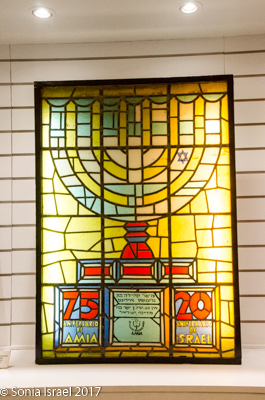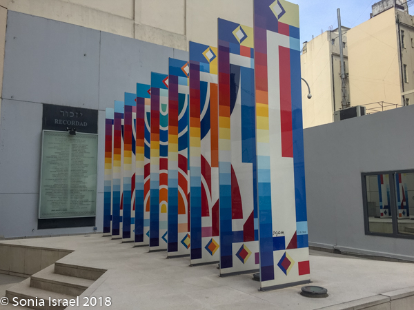 There is a story associated with each of nine panels and another story with the view of each panel. The stories begin with the chaos surrounding the explosion and end with the strengthening and renewed hope of the Jewish community: Destruction, Chanukah, a white Magen David, rainbow, menorah, multiple colored Magen David, and finally, the symbol of AMIA. Our guide told us that this is a âvisual prayerâ that has become a symbol against terrorism. âIt is a permanent expression of the Jewish peopleâs struggle for truth, justice, and peace.â It also âbears witness to the reconstruction of the Argentine Jewish community.â