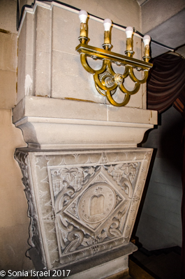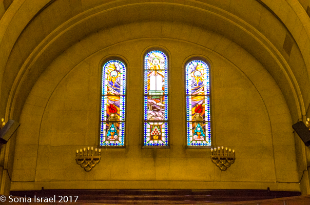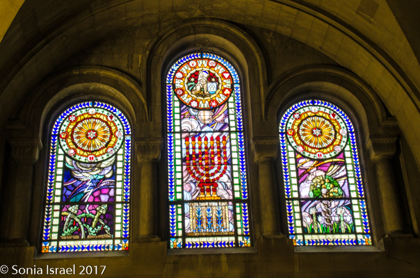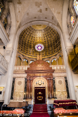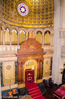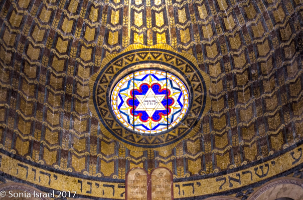 But we could see the inside of the temple. The sanctuary is quite large, as we have seen in many synagogues in Europe. There are enough seats for 1000 congregants. The architecture of the temple is a combination of Romanesque and Byzantine with traditional Jewish motifs. Although there is a balcony which makes one think it is Orthodox, separating men and women, it is actually a conservative synagogue. The sanctuary is extravagantly decorated with ornate stone reliefs of the Ten Commandments and Jewish stars, a soaring ceiling and stained-glass windows. The apse culminates in a half dome covered in gold and in the shape of a oyster shell and is adorned with sheaves of wheat and the words of the Shma (Jewish prayer).