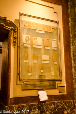 From the Plaza de Mayo we walked towards the Metropolitan Cathedral (see post on “Buenos Aires – so much to see, do and eat” for more info and pictures).  The Cathedral itself is quite beautiful, but we were not there because of that. We were there to see a most unusual memorial. It is a Holocaust Memorial, known as the Commemorative Mural, the only one of its kind inside a Christian Cathedral. And not only is it a Holocaust Memorial, it is also a memorial to those murdered in the two terrorist attacks against the Jewish community (Israel Embassy and AMIA). It is a large case with two glass panels set into a silver frame (with a which hold Jewish artifacts, including a menorah, Star of David and sheets from prayer books (including a Passover Haggadah) that were rescued Treblinka, Auschwitz and the Warsaw Ghetto. There is also a copy of the only stamp in Hebrew issued in Argentina. This memorial speaks to the coexistence of different groups and respect for differences in Argentina. And on the four corners of the frame are engravings of the tree of life, a Menorah, the Ten Commandments and the Star of David.