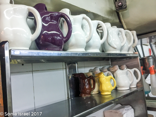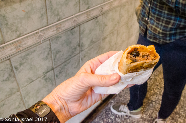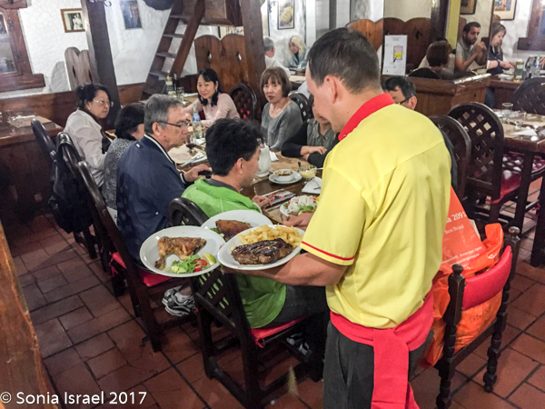 Now it was time to taste and eat again. This time we went to a restaurant, El Sanjuanino. Turns out it is right next door to Fervor, where we had just had dinner a few nights before. Their motto is “Eating is a biological act, Eating in El Sanjuanino is a cultural act.” They are known for the empanadas and for their wine. It was a bit early for us to have wine (although many Argentinians would disagree). The restaurant had tables set closely together on the main level, and more tables down below. There was a wonderful tile mural of what a store in the olden days would have looked like. And they had penguin pitchers (pinguinos), whole shelves of them. Why penguin pitchers? This is the traditional way wine is served in Argentina. They used to be made of aluminum and started being used in the 1940’s, filled with Mendoza wine cut with water or soda. Today they porcelain and come in many colors, sometimes with ties or bowties. But no matter how much I begged to buy one, they refused me.