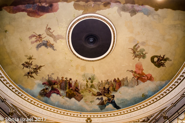 Why were we going to a bookstore? Well, the El Ateneo Bookstore is a 100-year old theater that was converted into a bookstore, which makes it one of the more (if not most) beautiful bookstores in the world. The ceiling is domed with beautiful murals. The balcony’s are still there so you can browse books while looking down at the stage, which is now a café. It was fun, fun, fun to walk around and watch the people, half of whom were actually buying books (yes, real books) and the other half, like us, were just mesmerized by the building itself.
