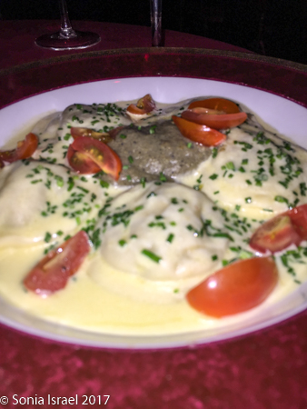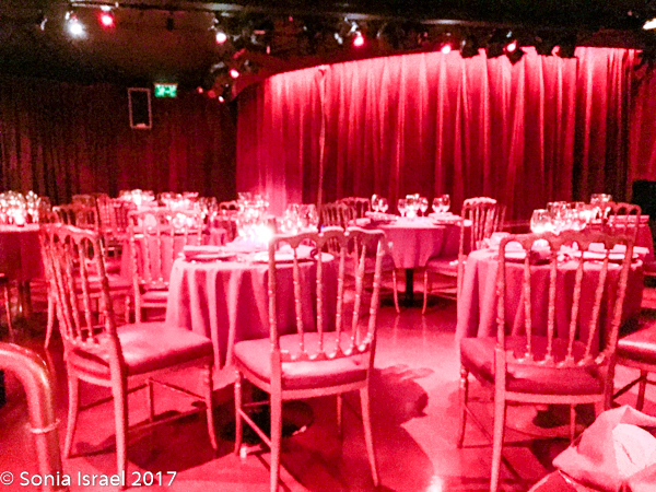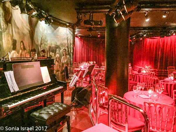 And then we were invited into the cabaret theater which was also all red. Red floor. Red chairs. Red tables. Red lights. There were about 20 tables for the whole place each with the chairs facing the stage. It was very dark, which made taking photos difficult. We were seated right away and offered wine or champagne, which flowed freely all night. The menu had three items from which to choose. For appetizer we could have shrimp and potato salad, burrata cheese with confited tomatoes, or mustard infused turkey breast with brie cheese, mushrooms and roasted tomatoes. For the main course the choices included beef tenderloin with truffle mashed potatoes and sautéed mushrooms, , salmon with goat cheese and corn cake, or lamb ravioli with smoked tomatoes and eggplant. And of course, dessert was cream of passion fruit with almond crumble, bittersweet Chocolate’s Marquise or banana Mousse with caramel and olive cake. Let’s just say we were not there for the food. We were there for the entertainment.