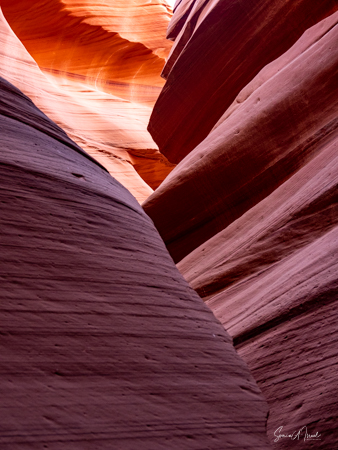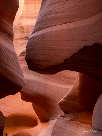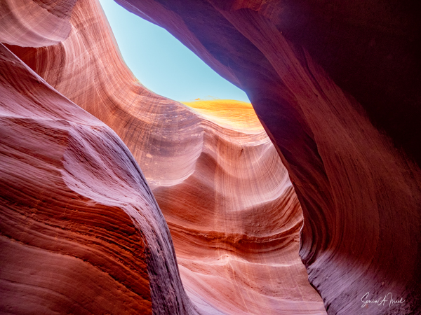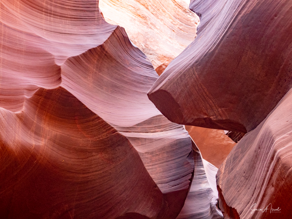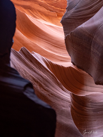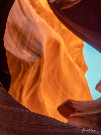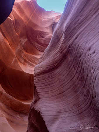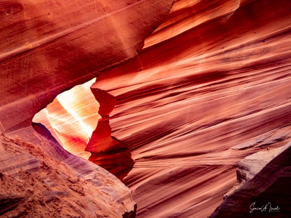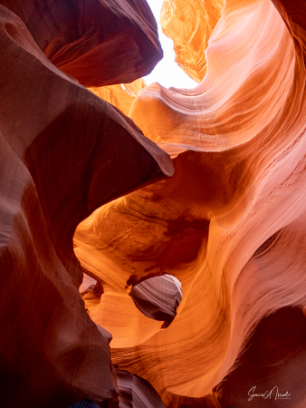 There are two parts of Antelope Canyon that are often visited, the Upper (The Crack) and Lower Canyons (The Corkscrew). But there are also three other slot canyons here, the Rattle Snake, the Owl and the Mountain Sheep Canyons. They are all slot canyons which means a very narrow gorge with steep and high walls made from basalt or sandstone. Slot canyons are deeper than they are wide and are very prone to flash floods which can make them dangerous.