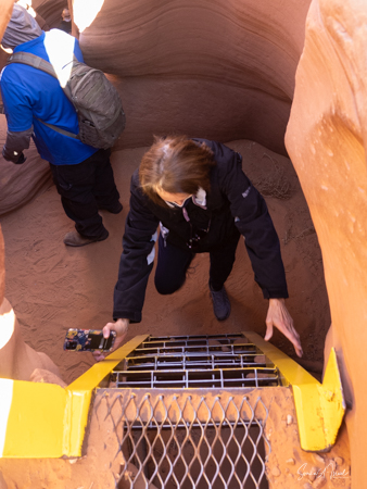 We did get to the entrance and headed down our first flight of narrow stairs. These were the last stairs we saw, as the rest of the ups and downs were on ladders. This part of the canyon is about 1,335 feet long so there was lots of walking to do.