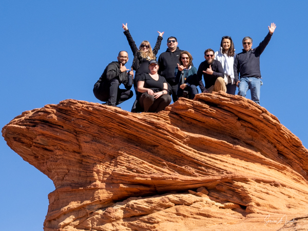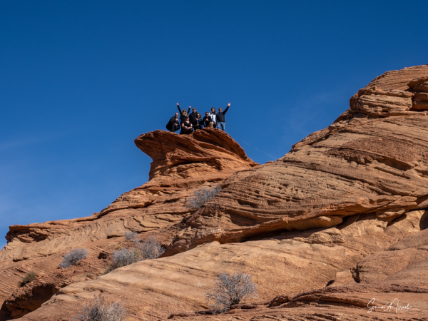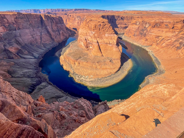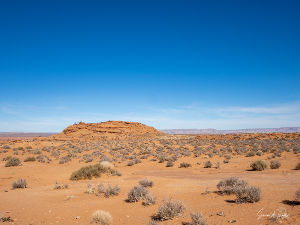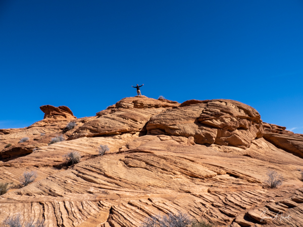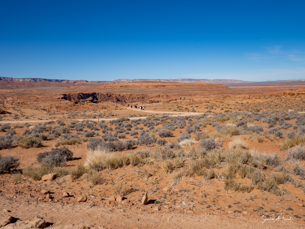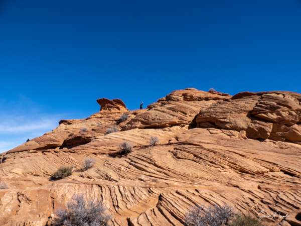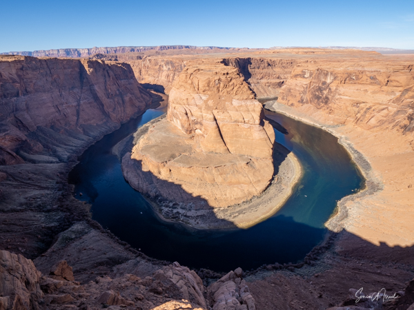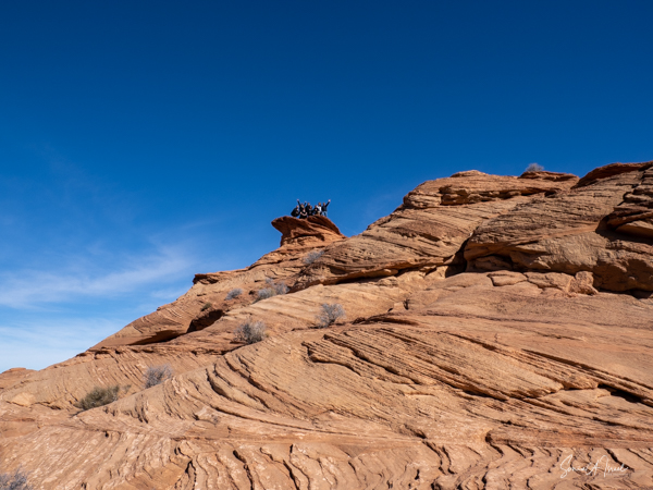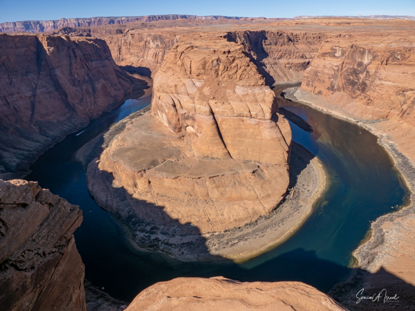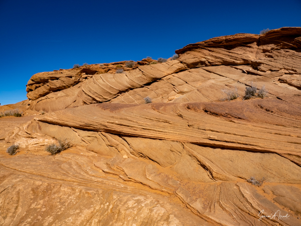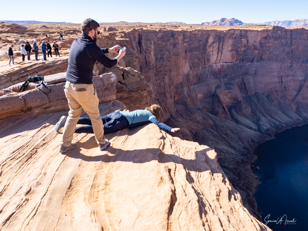 Our next stop was Horseshoe Bend. As the name suggests, it is a horseshoe shaped part of the Colorado River, also near Page, Arizona. It is a fabulous example of water following the path of least resistance. Some people call this the East rim of the Grand Canyon. Horseshoe is thought to be one of the most unique geological phenomenon found within the Glen Canyon National Recreation Area.  The sheer cliff rock walls are dense Navajo sandstone which act as a natural barrier to the flow of the river, forcing the Colorado River to turn sharply and travel through softer rock.