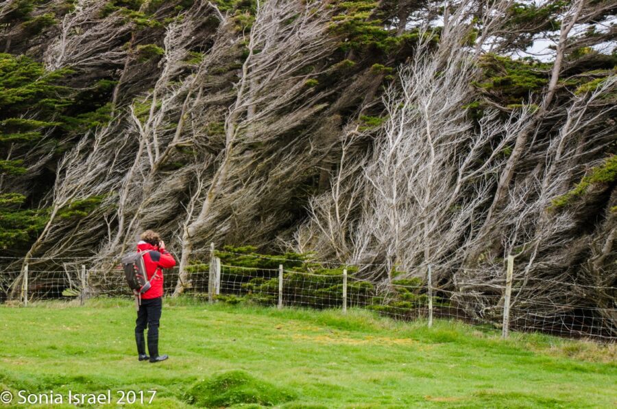 We were bused over to town, where after a quick cup of coffee and some cookies at the Malvinas Hotel, we were taken on an hour drive to the Mount Pleasant International Airport which is on the British Forces South Atlantic Islands Mount Pleasant Complex, i.e., the military base. Our private charter was given special permission to land for one hour (not a moment more) to drop off the next group of guests and take us back to Santiago. (Remember, we came from Buenos Aires, but you can’t fly from the Falklands to Argentina. You now know why). And then we reached the base. It immediately looked different as it had a fence of trees, trees on an island that has almost none. And all the trees were bent with the wind.