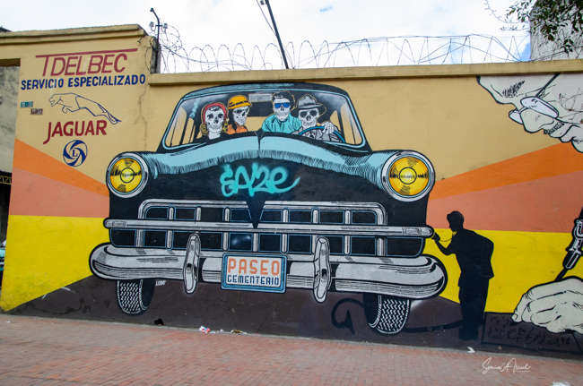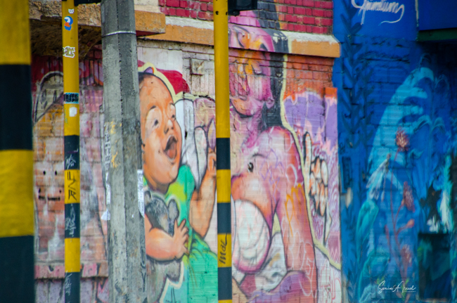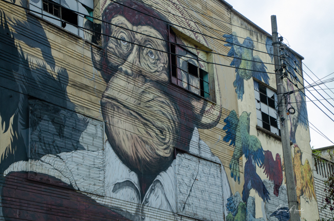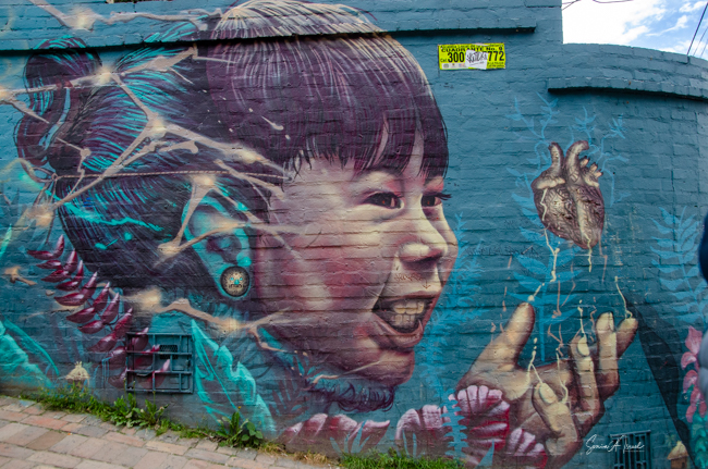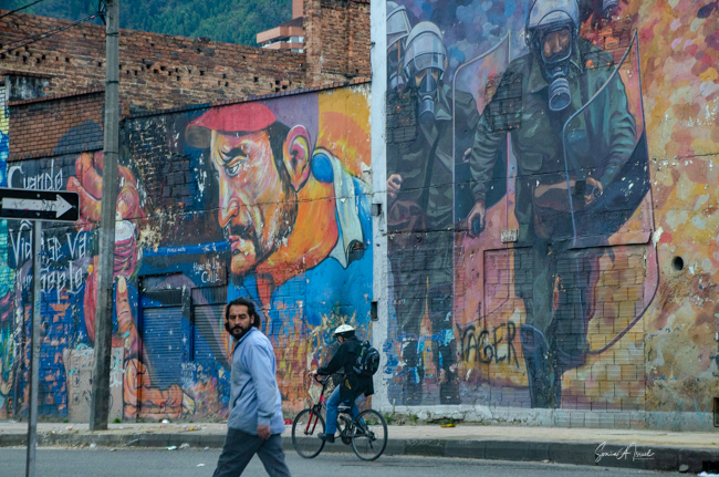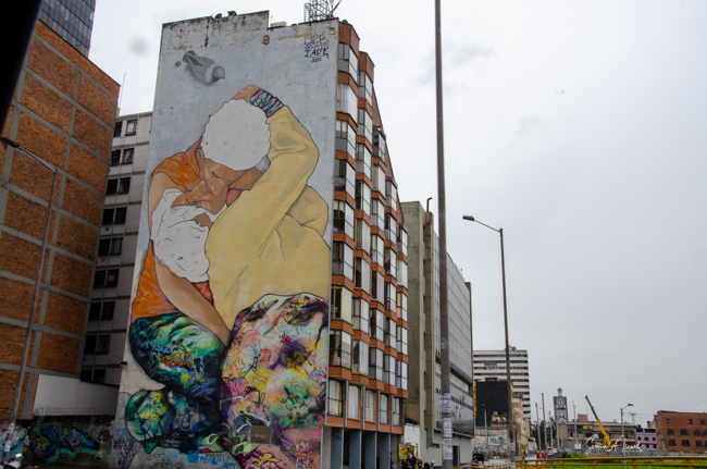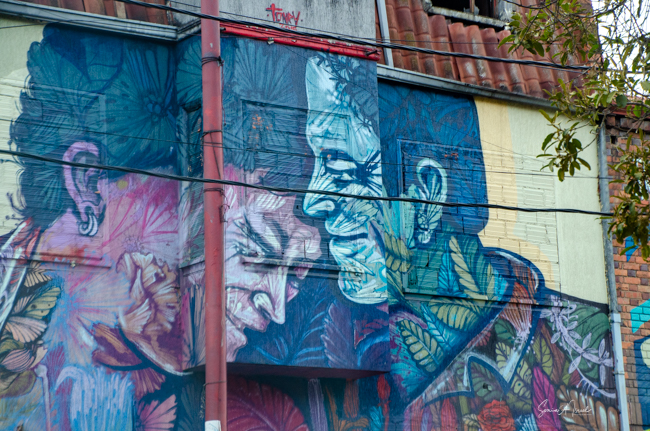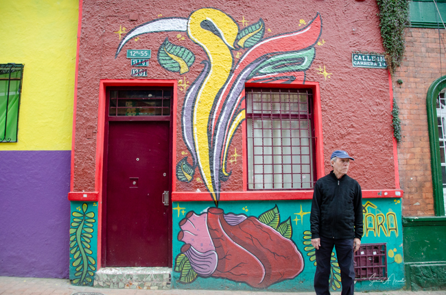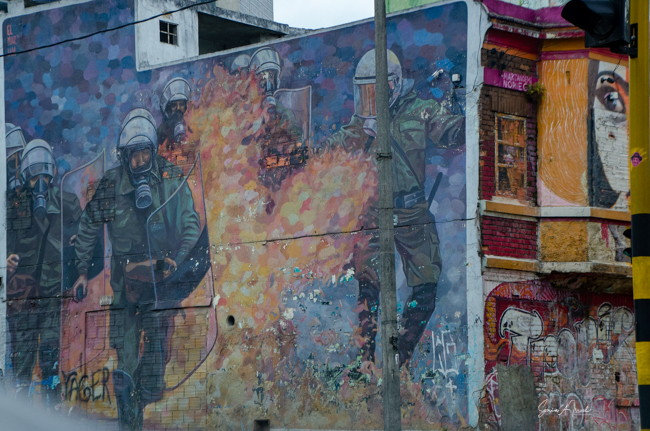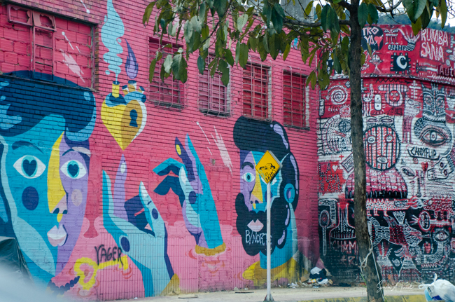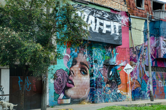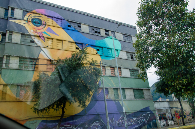 Juan then took us to see street art, called graffiti, but much more beautiful. If you read my chapters on Caratagena and Medellin, you know that street art is a big thing in Colombia. The colorful, vivid, huge murals on the sides of the buildings were spectacular. There is street art all over the La Candelaira area, the Old Town, which we would visit later in the afternoon, but this was a single street in the Santa Fe area that we slowly drove through, with each building covered in art depicting people, animals, politics, and so much more.
