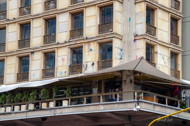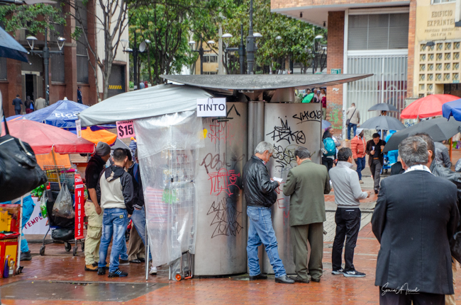 Juan parked his car and we started walking along Avendia Jimenez, now a pedestrian mall. This was once the boundary of the city and over time, saw its share of riots and violence, but today it is a beautiful walking street, even in the rain, surrounded by colonial churches, the Gold Museum, and the El Tiempo building (the Bogata newspaper) which is still filled with bullet holes from violent days gone past.