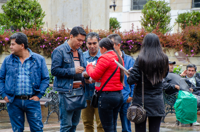 We stopped at the Plaza del Rosario, one of the plazas along the way, filled with small groups of men and women huddling over small pieces of paper. Juan asked us if we knew what they were doing. We guessed and guessed, but never got it right. This was the famous emerald market, just outside the Emerald Trade Center.