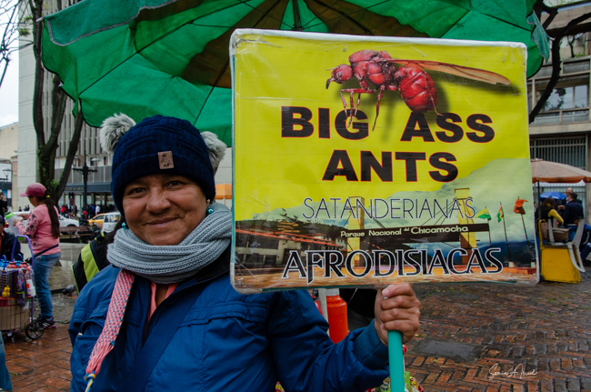 After lunch we meandered back on Avenida Jimenez. At one end of the avenue is the Santander Park, once called Parque de San Francisco because it was next to the San Francisco convent and church. In the middle of the park, along with a a beautiful fountain is a statue of Franciso de Paula Santander, a Colombian military and politician famous for helping in the fight for independence alongside Simon Bolivar. The park was full of people, as the rain had stopped, and vendors were everywhere. One was selling “Big Ass Ants.” I had no intention of buying or eating ants, but the vendor did give me a big smile for a picture.