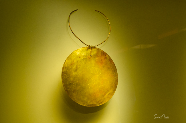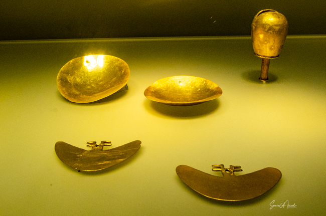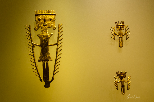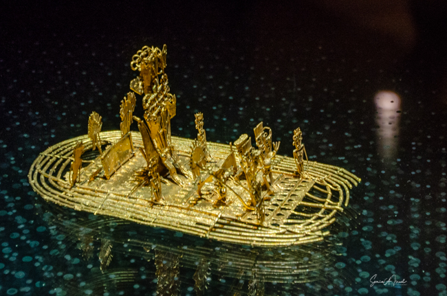 Or as it was written in the museum: “By that lake of Guatavita they made a great raft of reeds, decorating it as beautifully as they could…They undressed the heir, anointed him with a sticky earth and dusted him with ground and powdered gold, so that he went in the raft completely covered with this metal. The golden Indian made his offering, casting all the gold and emeralds he had brought into the middle of the lake, and the four chieftains who were with him made their own offerings; and when the raft landed the feast commenced, flutes and conch shell trumpets, with great dances in circles according to their custom, with which ceremony they received the new ruler and acclaimed him their lord and prince. From this ceremony came the celebrated name of El Dorado.” (Juan Rodriguez Freyle, 1636)