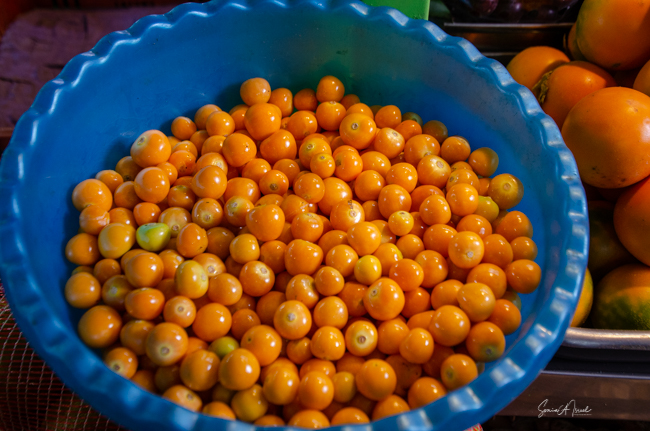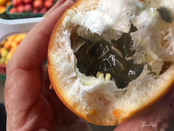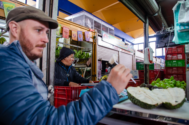 And for me, this is the epitome of why I travel. The large, large hall was full of colors, smells and as we would find out, tastes. But the best part was watching the people, both those buying and those selling. Juan knew many of the vendors and knew exactly where he wanted to take us and what fruit he wanted us to taste. At each stall, he would chat with the vendor, catching up and choosing the specific piece of fruit we should taste – or letting the “professional,” the vendor, choose for us. We tasted a tomato whose flvor burst in our mouths. We tasted lulos (“little oranges,” which we call Naranjilla, and which were very sour), sour sop (a greenish-yellow color, prickly skin, and creamy, white flesh tasting like a combination of strawberry and apple, but with a little citrus mixed in), avocado, granadillas (small egg or football shaped orange fruit full of little black seeds which we ate with a spoon. It is related to passion fruit, with a sweet and sour taste), and nispero (loquats which I have growing in my backyard).