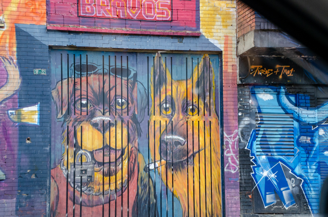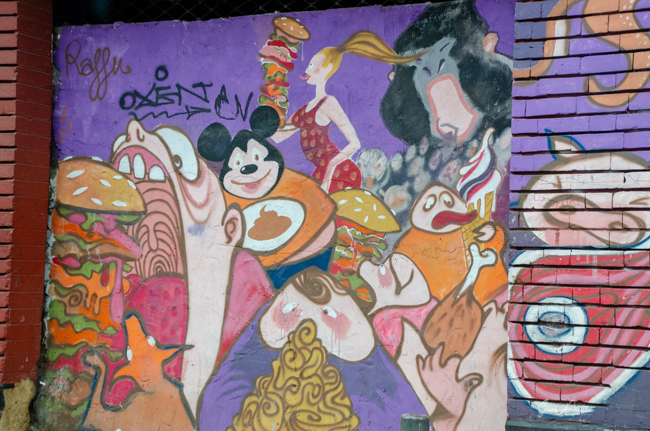 The first thing we noticed, through the raindrops, were the large painted street art murals. We would see many more in the next few days, but the shear size of these along with their colorful beauty, sure caught our eyes.