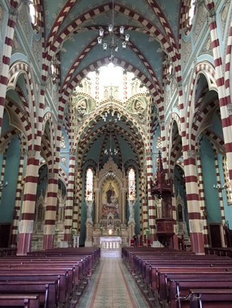 I mentioned that there are 400 churches in this area. We stopped in one of them, Santuario Neustra Senora Del Carmen (the National Shrine of Our Lady of Carmen), which towers above the neighborhood. It would be hard to miss this beautiful church as the façade is all red and white stripes of Venetian mosaics, a pattern that can also be found inside the church. Although built in the Florentine Gothic Style, the church is most known for its Byzantine and Moorish touches.