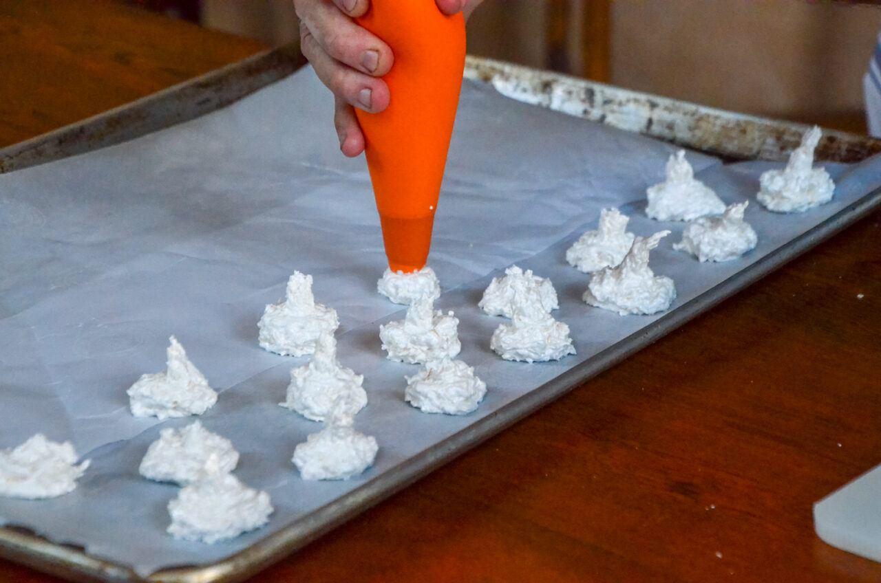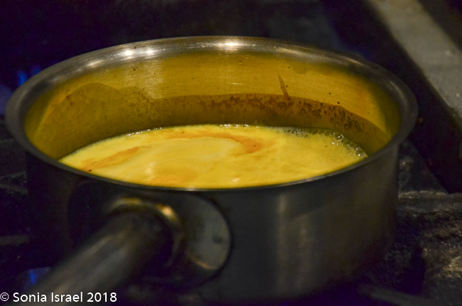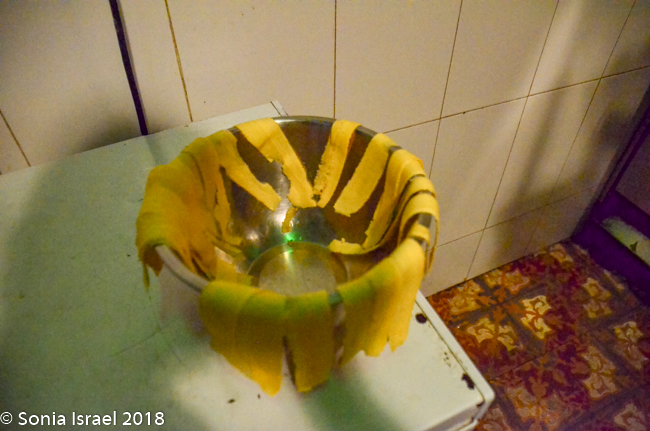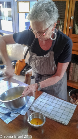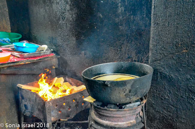 After a few hours, we got to sit down for lunch. What did we have? We started with plantain chips (another staple) and other appetizers, ceviche (without cilantro for me), arroz apastelado (sticky rice), tomato tree salad, hogao (a savory salsa of tomatoes, onions, garlic, cilantro [but not in ours], sautéed until they are soft) (tomatoes, onion and garlic sautéed in oil), chicken, and enyucado with passion fruit  and macaroon. What is enyucado?  It is a traditional Colombians cassava dessert cake made with ground boiled yucca, anise, sugar and sometimes guava jam. And hot chocolate, frothed at the table.
