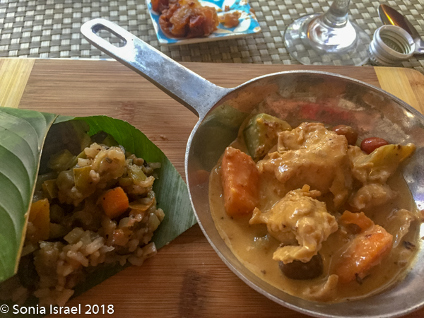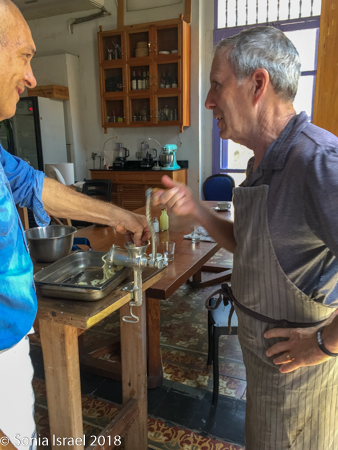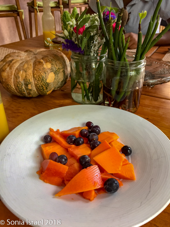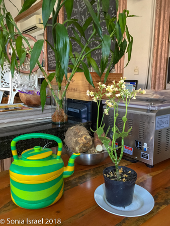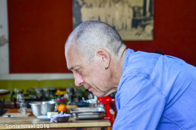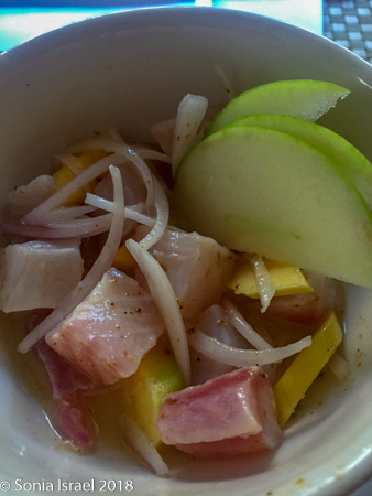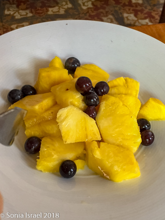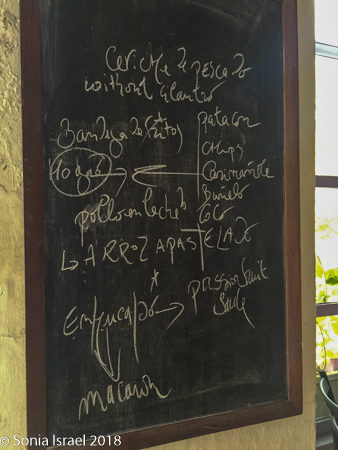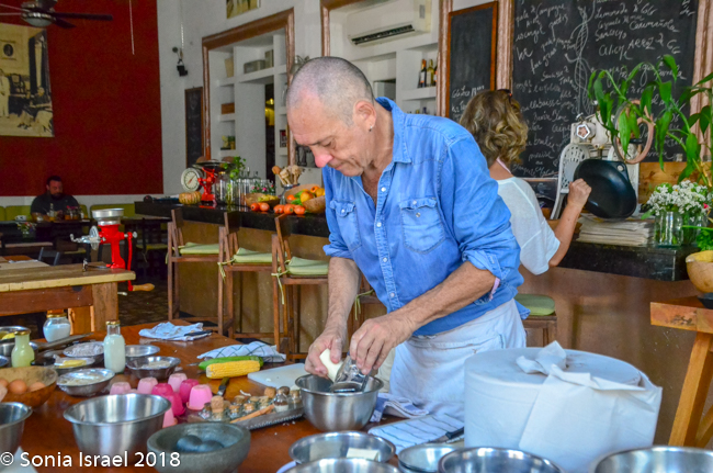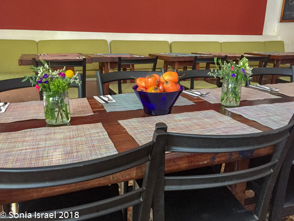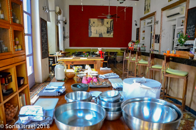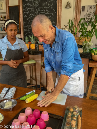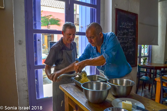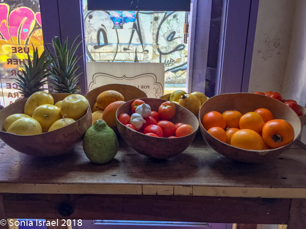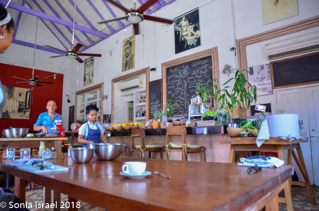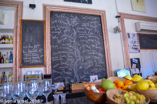 We drove back into the old town, through the walls and stopped by a purple and orange house with a mural across the street. That was Oh! Là Là. Gilles was there to greet us as the other helpers in the restaurant came out to carry all our purchases in. The restaurant is described as, “Owners, Carolina Velez and Gilles Dupart, are both on a mission to expand the healthy eating options in Cartagena and resurrect long-forgotten regional dishes with a modern, French flourish.”