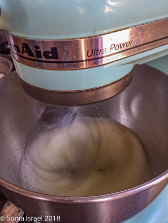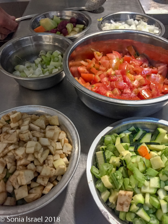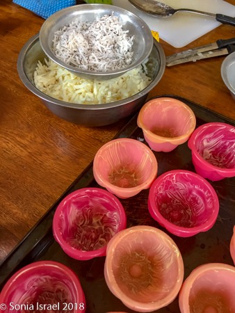 There was a long, large table on one side of the restaurant all set up with mixing bowls, mixing spoons, measuring cups, and all sorts of other implements. We were given aprons to put on and set to work.