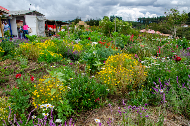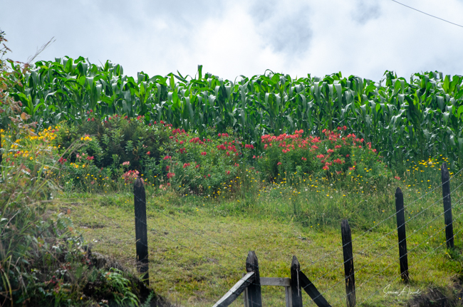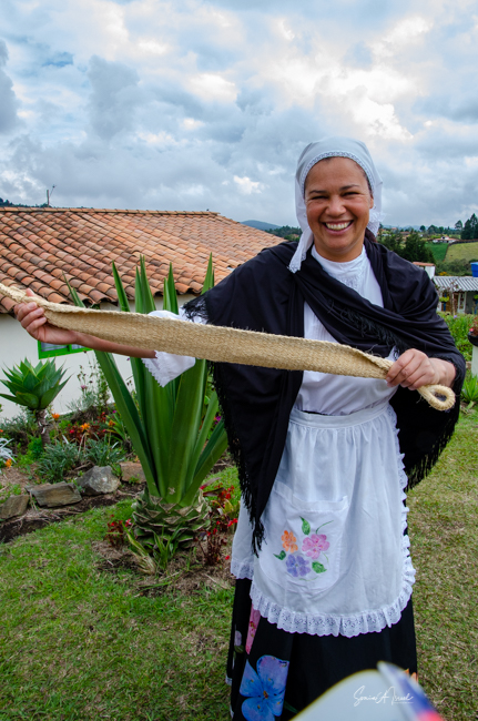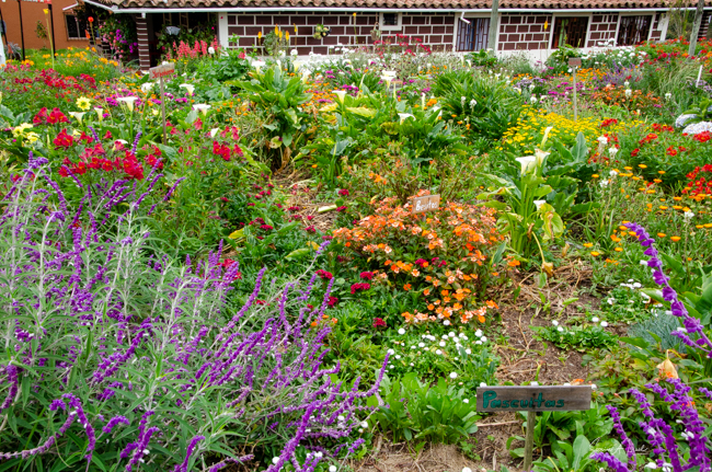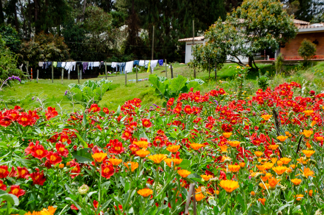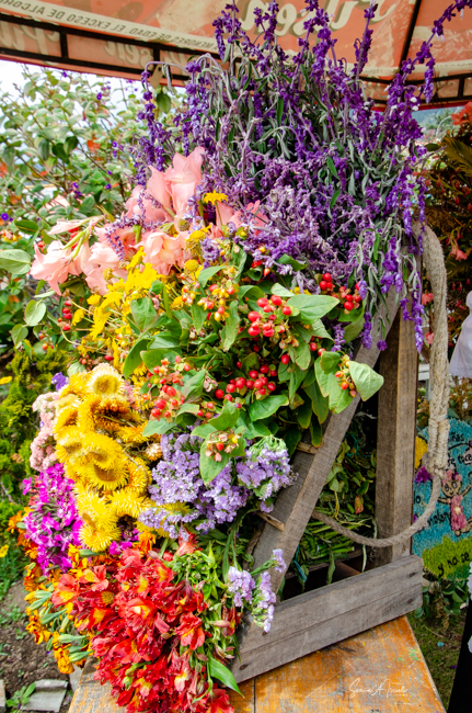 After driving about 15 more minutes, past small restaurants and homes, we finally arrived at Ignacio and Carmen Londono’s flower farm. We stepped out of the car and immediately put on our sweaters. While it had been quite hot in Medellin, here we were at 7000 feet above sea level and it was cold. Carmen came out to great us in the traditional silleteros dress.  Yes, more on that later too. We shook hands and she invited us into her home for mint tea. Of course, mint from her garden.