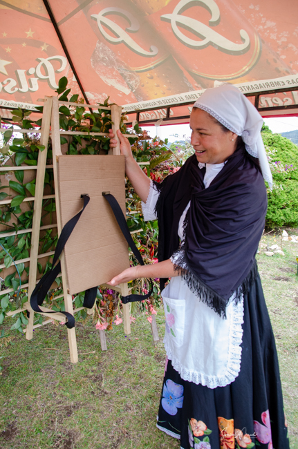 Carmen told us that they used to carry her grandmother that way. They also used to carry pregnant women from Santa Elena to Medellin to deliver their babies.  But then the Santa Elena indigenous locals changed the packages carried in the chairs from people to flowers and changed the chair for one with no legs. They began by transporting flowers from Santa Elena to cemeteries in Medellin.