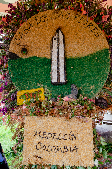 In the main festival and competition, they compete in four categories which are each judged on beauty, composition and variety of flowers. The four categories are traditional (ornate large flower arrangements), monumental (the largest one created by covering enormous circles with flowers; they can be 7 feet in diameter and they are heavy), emblematic (cultural symbols with messages) and commercial (flower arrangements with commercial logos). Between all the participants, over 600,000 flowers are used. The sillerteros also are hired for professional arrangements and offer other arrangements for sale. If you include these, there are about 1.5 million flowers used. And the oldest silletero is 86 years old!