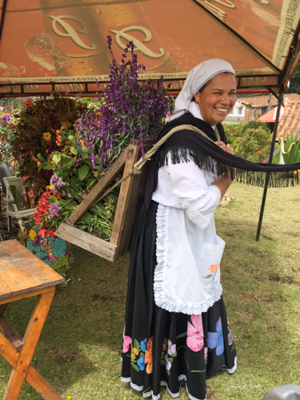 Carmen was wearing the traditional outfit of the silleteros. It was a black dress with flowers on it. It had a shawl for when they wanted to stop in church. It had a pocket in the front for money. The shirt was buttoned up to the top in case it was cold. She wore black sandals that laced up her legs, and a scarf around her head. Children all have the same costume. Juan Carlos told us that he had to have one for his son in Medellin as well as on the day of the flower parade, everyone wears it.