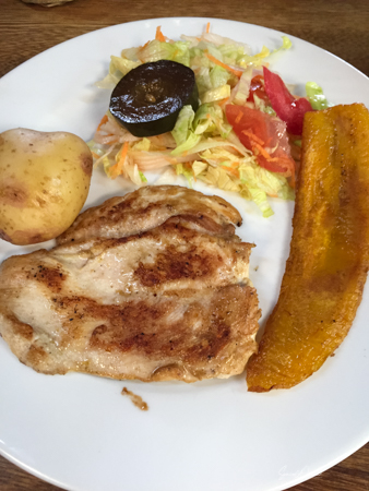 There were a few in a row along with some shops. One was cooking outside. That’s not where we ate. One day we ate at Cesar Cocina. The other day we ate at La Montinita. Both times the meals were the typical Colombian meal – chicken or beef, salad and rice/beans or vegetables.