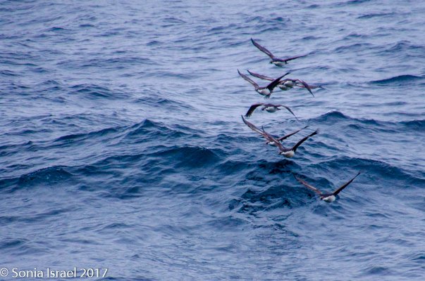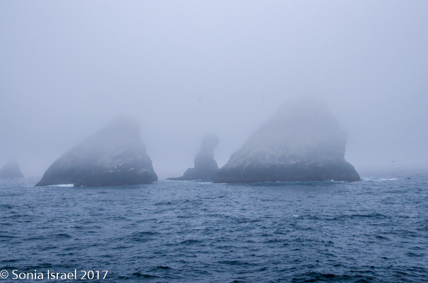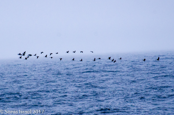 At some point, we passed Shag Rocks, six small islands that lie 150 miles west of South Georgia. These islands are home to South Georgia shags, prions and the wandering albatross. But they were covered in fog as we sailed by. Nevertheless, after we passed them and could only see them in the distance, the sky was suddenly filled with birds, flying in formation, flying all over the place, and almost darkening the sky. They must have been off looking for food to bring back to the rocks.