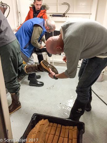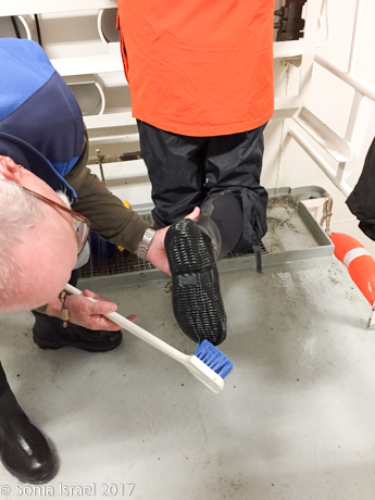 We also had a mandatory IAATO lecture on how to make sure we don’t bring any seeds or other contaminants onto South Georgia. As with the life boat drill, Doug took a roll call to be sure each cabin was present. We had to have anything that had been out in the Falklands such as boots, anything with Velcro, cuffs in pants, examined, cleaned and disinfected. And each time we would leave or enter the ship, we would step through disinfectant.