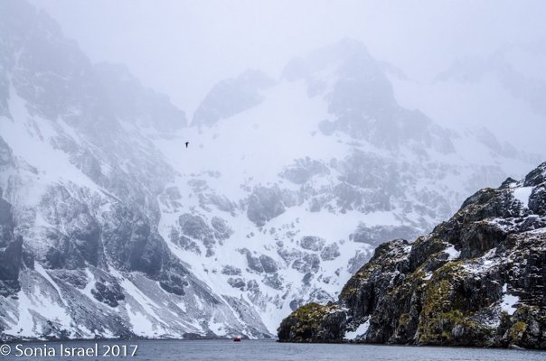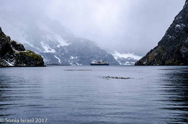 It was a cold, rainy and windy day. We threw on some warm clothes and made our way to the bridge. We were in a cove of the southernmost fjord in South Georgia, Drygalski Fjord, at the very end of it, standing in front of huge glaciers. This fjord is 8.5 miles long and its scenery was exquisite. There were snow petrels flying everywhere, their white feathers often blending into the snow behind them. We learned that 60% of South Georgia is glacier, but most of the glaciers do not make it all the way to the water’s edge. This glacier descends down the mountain right into the bay. It was white, with crevices in blue, and then whole large areas that were a frosted blue (which means the ice is more dense). The glaciers are so strong that they carve the mountains, giving the fiord a dramatic look. And the mountains? They are 6000-7000 feet tall.