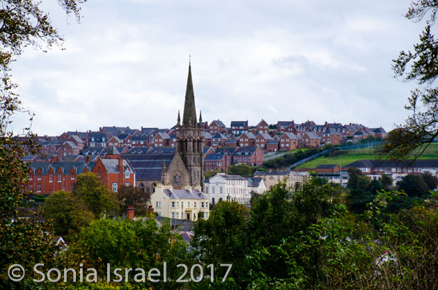 The hills were literally rolling. The mountains were covered in trees in fall colors. The sky turned blue as we crossed into North Ireland. And that combination of colors was awe inspiring. We passed lakes. We passed a church and/or cathedral in every village and each had an old graveyard by its side. Each village had colorful houses lined up on the main street.