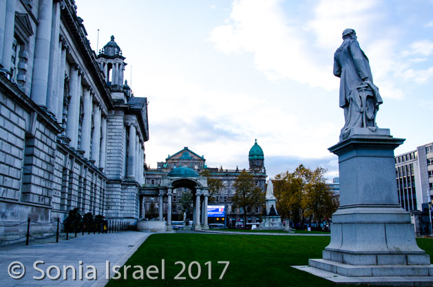 We pulled into our hotel, the Belfast Hilton, which was across the street from the court, behind the concert hall, and just a few blocks from City Hall and City Center. We had about an hour to ourselves, so of course Andy and I donned our jackets and went walking and exploring. We walked to the City Hall which I think is as beautiful as many of our buildings in D.C. Interestingly, while the courts had walls and cameras (even to this day) protecting it, City Hall did not. That is because the trials took place in the courthouse and not City Hall.
