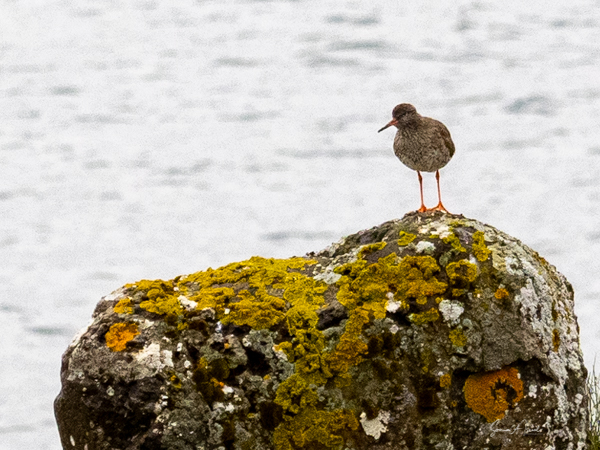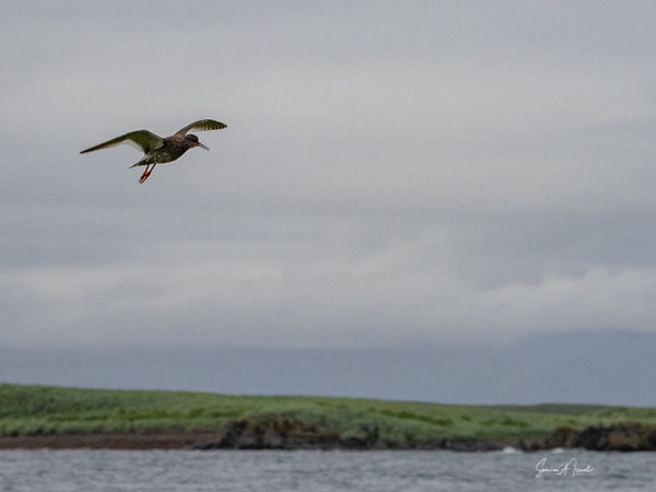The redshank is from the Tringa species and likes to live in marches or moist meadows while breeding. Other times they prefer to live along the sea. The island of Flatey provides both those things. The bird itself is considered a medium sized wader at about 5.3 ounces and about 10 inches long. It is particularly funny to watch it fly as it flies in a zig zag motion interspersed with gliding. The bird we first saw was sitting on a rock which is it seems to like to do, watching over it’s nesting area. But you don’t have to see the bird to know it is there. All you have to do it listen because the redshank’s cry is so distinctive: tííjúú-tííjúú-tjiikk-tjiikk.
