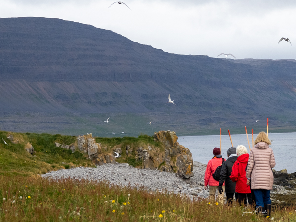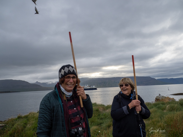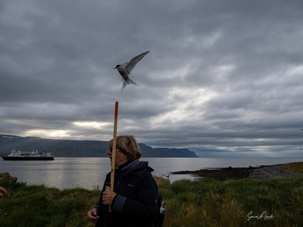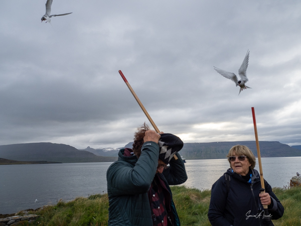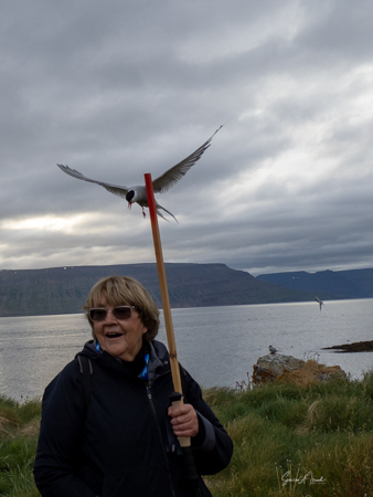 On the island of Vigur, as the sun was setting, they followed us along the path by the water and then, as we stood around in a group listening to our guide, they began attacking in seriousness. One of our new friends, Margaret, held her stick up high and one particular bird kept dive-bombing her. The tern would attack the stick and Margaret would cover her head. Luckily no one was hurt.