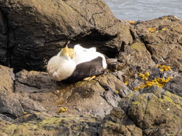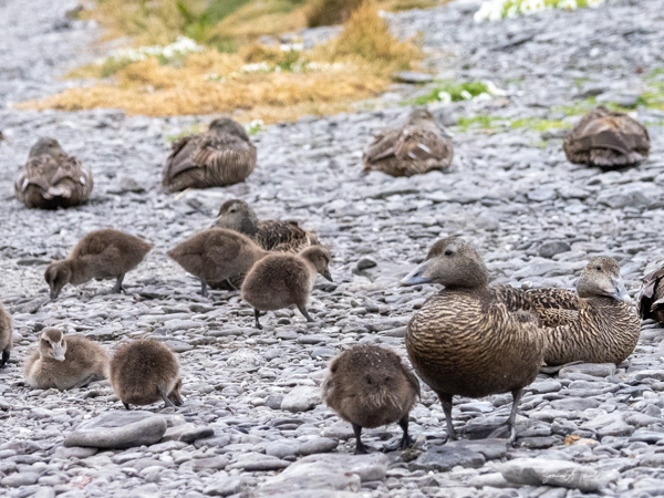 We saw a few eider ducks first on Flatey and later on Vigur Island, which has about 4000 ducks. These are large ducks (about 20-28 inches long) who build their nests close to the sea. We only saw one male on Flatey Island and he had his head tucked beneath his wing, sleeping the entire time. But we saw several females and lots of chicks. The females looked like they had been carved and sculpted. Beautiful.