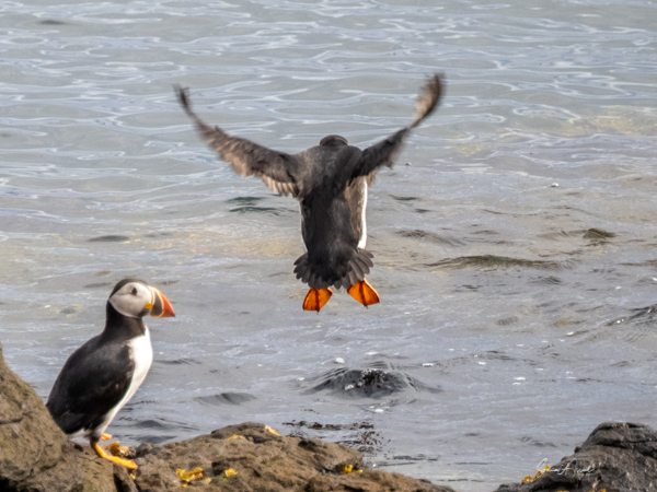 Although puffins spend most of their lives on the water, they are still called the clowns of the sea. That may be in part because of their bright orange beaks. But more likely it is because of how they take off and land both of which have been described as a comedy routine. I watched them take off and land for many, many minutes at all the different sites. To take off, they get a running start. You see their little orange-red feet running as fast as they can, on land or on the water, and then they flap their wings and take off. Yes, they can actually run on the water! And when they land, they seem to stop in mid-air, put their orange-red feet down below them, and like a helicopter, settle down onto the ground. If they are landing on the water they look like they are doing a belly-flop or tumbling and rolling on the surface of the water. I must admit they were quite funny to watch.